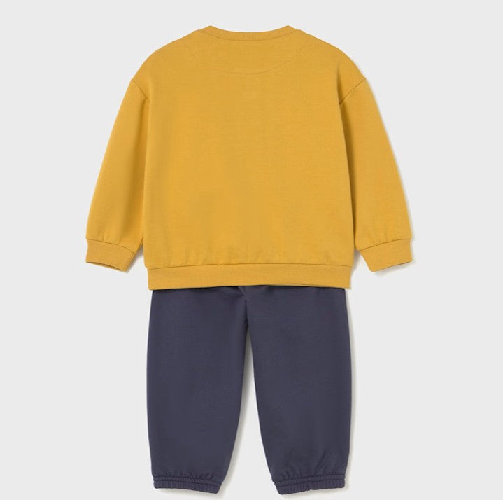 Yellow sweatshirt with tractor design   on the front  and matching navy jog bottoms. Mayoral 2838 boys tracksuit available on kidstuff.ie Back view