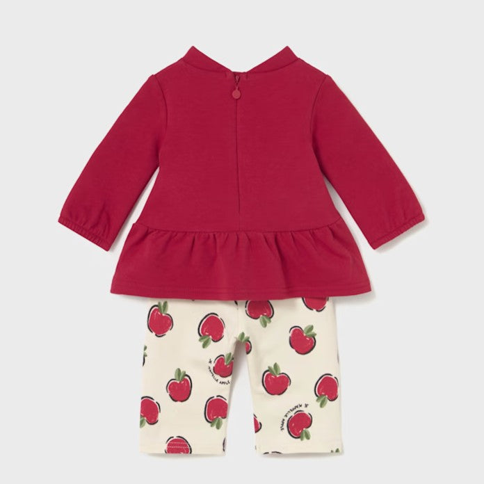 Lovely apple-print 2 piece outfit for a baby girl. Long sleeved red top with elasticated cuffs and a round neckline. Handy concealed zip to back neckline. Decorative apple applique to the front and peplum frill to the hem.
