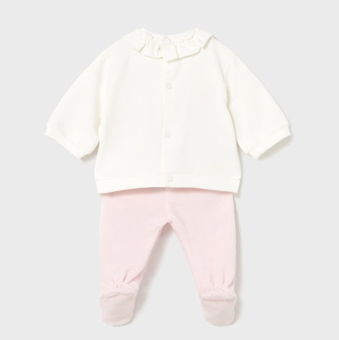 Baby girl's outfit with cream top with embroidered polka-dots and matching pink pants with feet in. Mayoral  2555 baby outfit available on kidstuff.ie