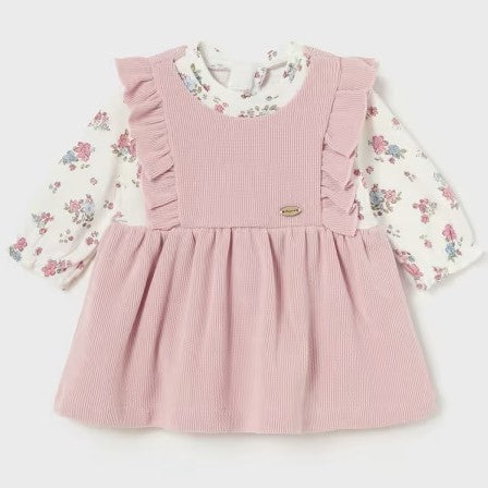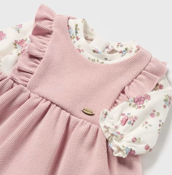A lovely one piece outfit for a baby girl which is cleverly made to look like a pinafore dress over a long-sleeved blouse . Pinafore dress in soft , dusty pink, ribbed knit fabric, attached blouse in flower-print cotton jersey. Centre back concealed zipper. Made by Mayoral. Why not team with cosy tights and a cute headband for a very pretty look.
