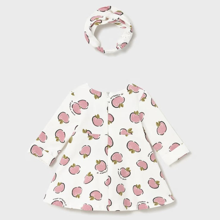 Baby dress with pink apple pattern on cream and matching headband . Mayoral 2827 baby dress se available on kidstuff.ie