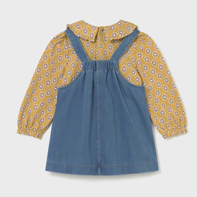 Co-ordinating long sleeved, flower-print jersey blouse in honey yellow has a frill edged collar and elasticated cuffs. Back opening with poppers. Made by Mayoral and available on kidstuff.ie