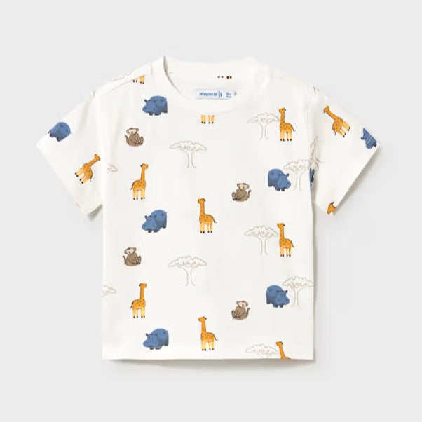 3 Piece cotton jersey set for a boy comprising 2 tee-shirts and a pair of navy shorts. One tee is printed with fun animals on cream, the second tee is yellow with "Animal Paradise" logo The shorts match both tops and have an elasticated waist for comfort. Made by Mayoral.